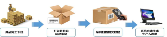 成品完工下線時(shí),將成品條碼打印并粘貼到包裝上,倉(cāng)庫(kù)人員先掃描生產(chǎn)訂單,并逐一掃描成品條碼,系統(tǒng)自動(dòng)關(guān)聯(lián)生產(chǎn)匯報(bào)單生成產(chǎn)品入庫(kù)單。